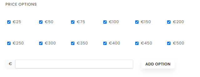 You can also add in your own price options here, if they are not already showing. Pop in the price and click add option.