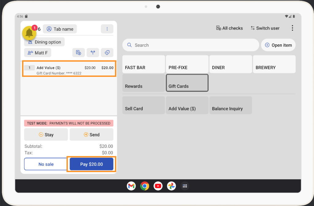 - You will now see the Add Value to this Gift Card as an item on the order Screen.